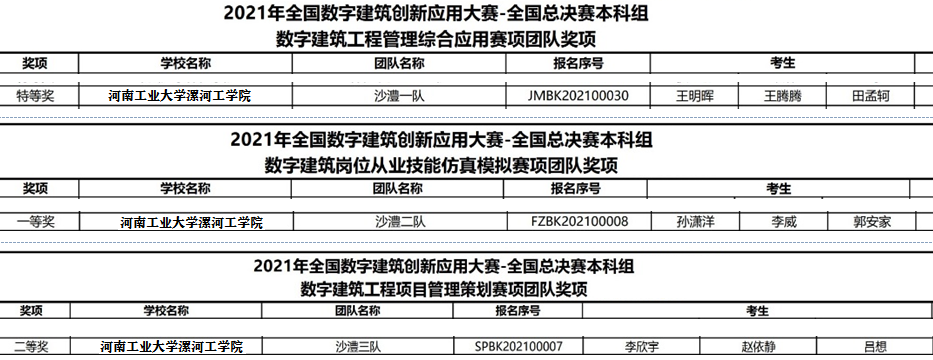 2021年全国数字建筑创新应用大赛全国总决赛于2021年11月6日在线上举办,共有291家院校、1352支团队参加,建筑工程系派出由2019级工程管理专业员工组成的三支队伍参加了数字建筑工程管理综合应用赛项、数字建筑岗位从业技能仿真模拟赛项和数字建筑工程项目管理策划赛项三个比赛项目,经过各高校间的激烈角逐,我系三支参赛队伍分别获得了团体特等奖、一等奖和二等奖。