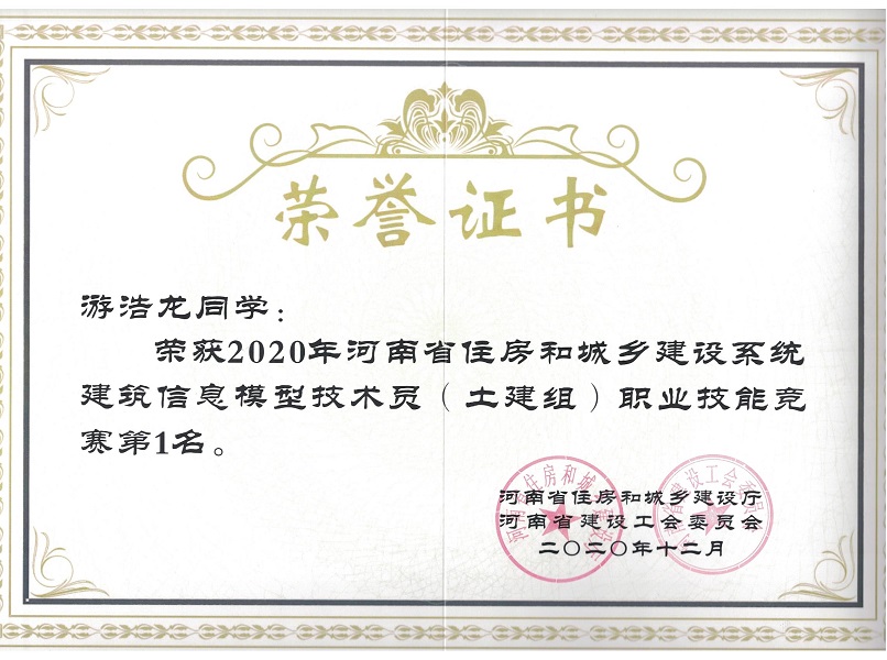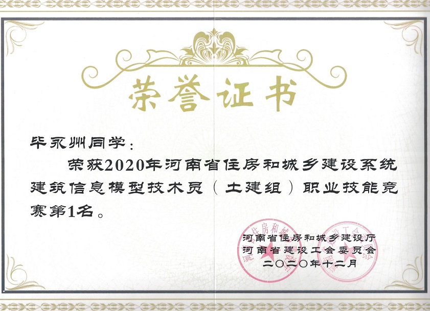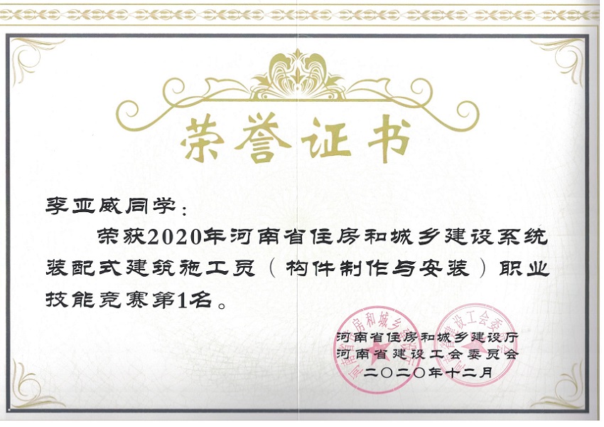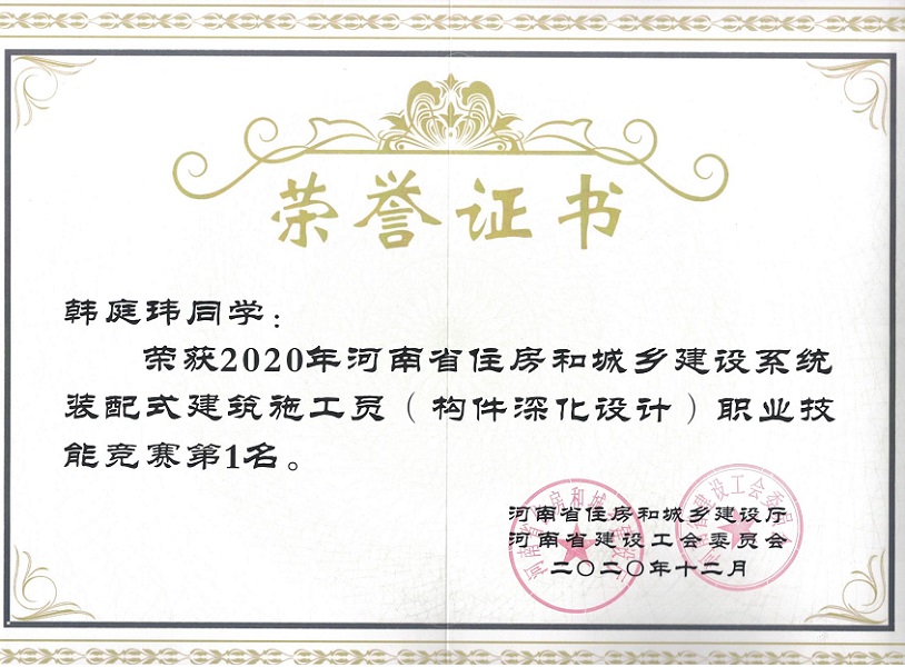 经过激烈角逐,河南工业大学漯河工公司韩庭玮荣获装配式建筑施工员(构件深化设计)第1名,董佳奇、李亚威荣获装配式建筑施工员(构件制作与安装)第1名,王泽华、李泽昕荣获装配式建筑施工员(构件制作与安装)第3名;毕永州、游浩龙、赵志远荣获建筑信息模型技术员(土建组)第1名。yl6809永利姬明辉、尹超凡、谢佳芮、王祥、张文龙荣获装配式建筑施工员优秀选手。河南工业大学漯河工公司荣获河南省住房和城乡建设系统职业技能竞赛组织工作先进单位,赵冬梅、刘惠林、徐志斌荣获先进个人。
