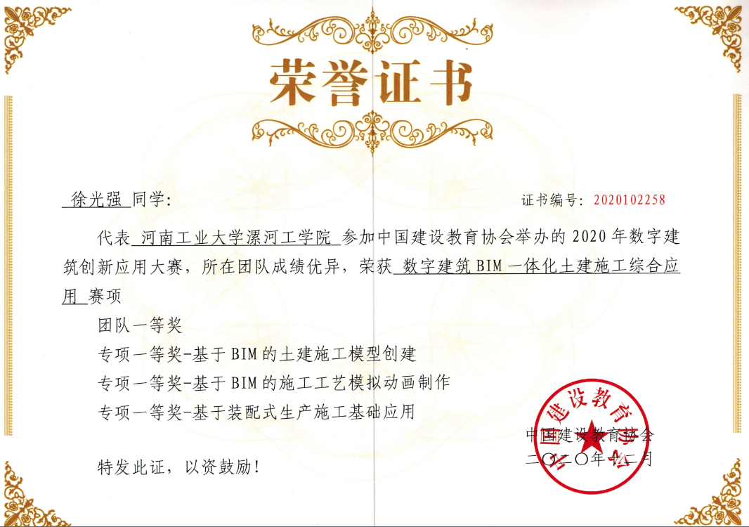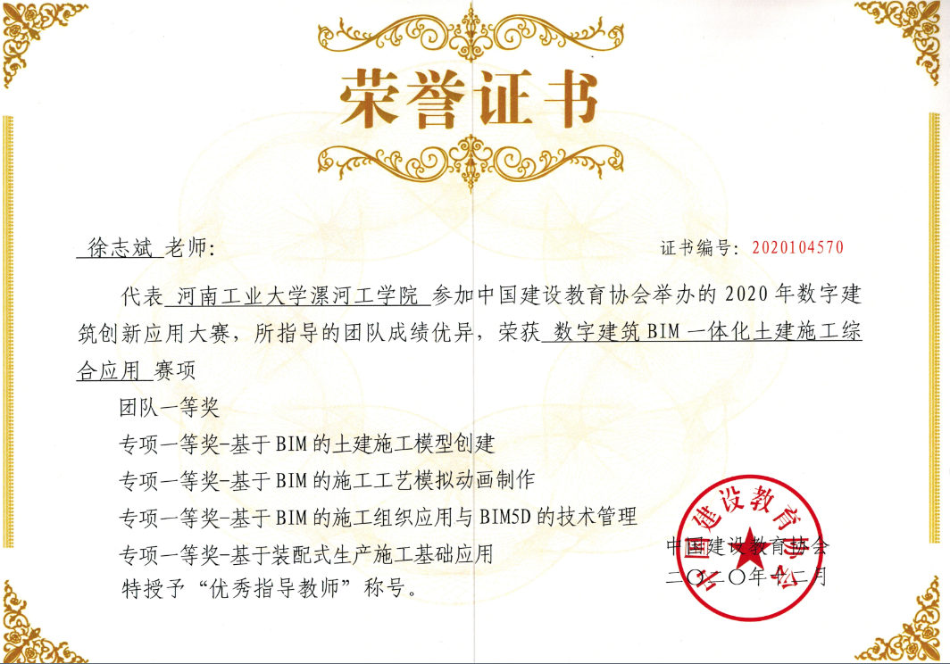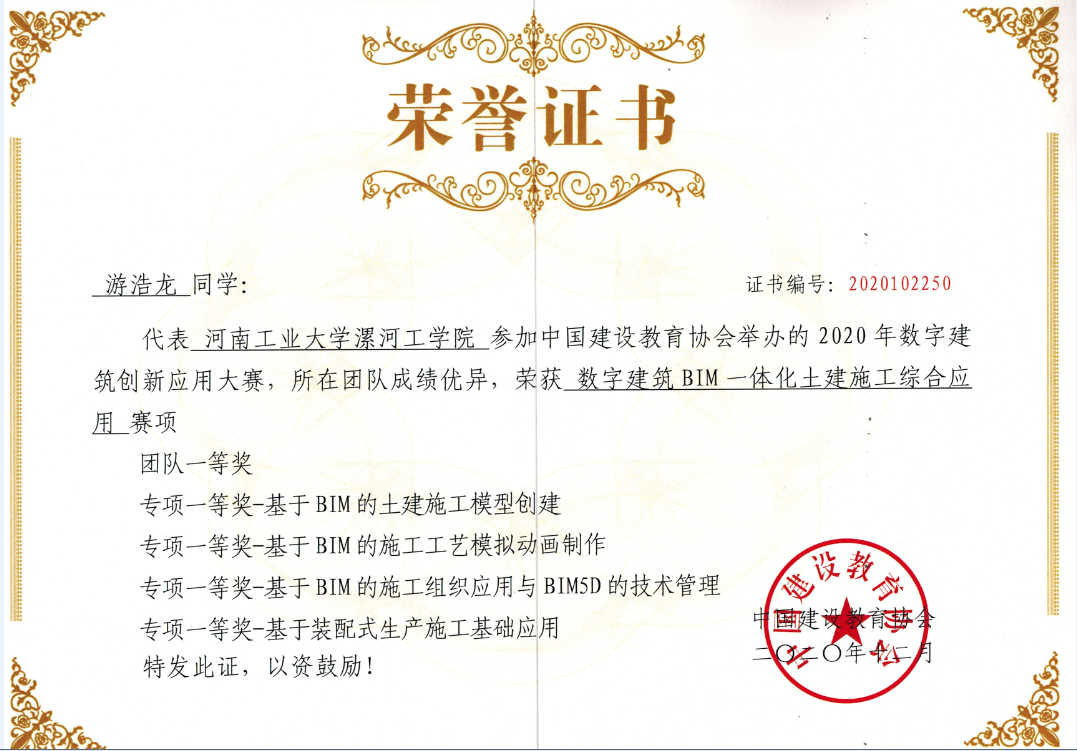 2020年数字建筑创新应用大赛(原“全国高等院校 BIM 应用技能大赛”)由中国建设教育协会主办,广联达科技股份有限公司、北京睿格致科技有限公司协办。由于疫情影响,大赛于2020年10月24日在线上举办,全国共有303所院校的2660个团队,13300名师生参赛。河南工业大学漯河工公司派出的2018级工程管理专业三支代表队全部荣获团体一等奖,并获11项个人专项一等奖,首次实现了参赛团队及个人全部获得一等奖大满贯的优异成绩。