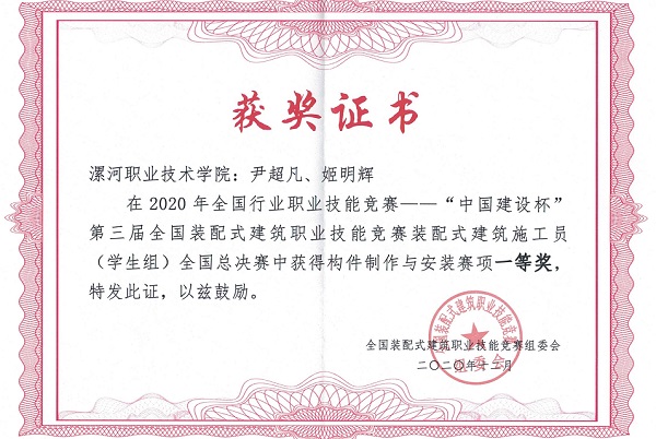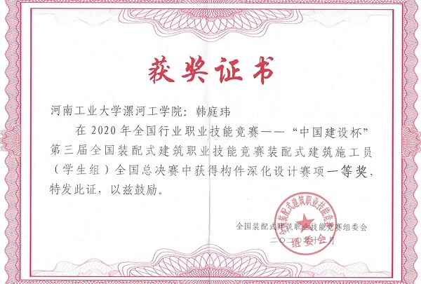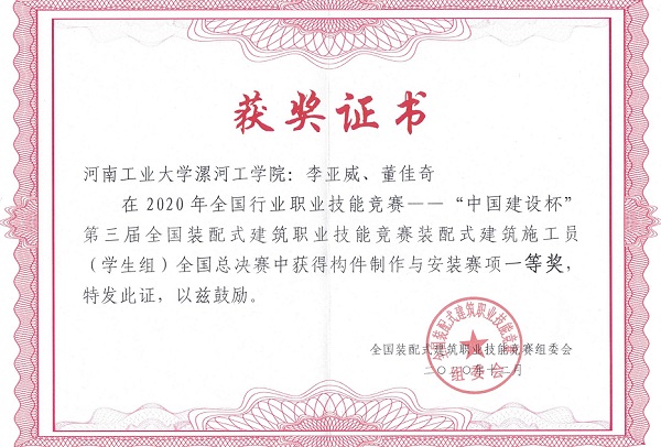 该项比赛属于人社部2020年全国行业职业技能竞赛73项二类职业技能竞赛之一,由住房和城乡建设部人事司指导举办。此次大赛历时两天,包含构件深化设计和构件制作与安装两个赛项。经过激烈角逐,河南工业大学漯河工公司2018级工程管理专业李亚威、董佳奇荣获构件制作与安装一等奖,韩庭玮荣获构件深化设计一等奖。yl6809永利2019级建筑工程技术专业尹超凡、姬明辉荣获构件制作与安装一等奖,张文龙荣获构件深化设计三等奖。刘惠林、赵冬梅、姚艳红、张彦鸽荣获优秀指导教师。