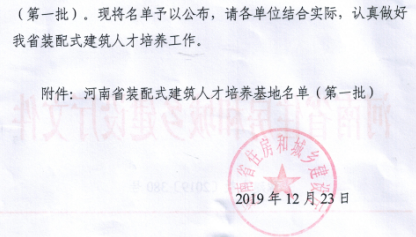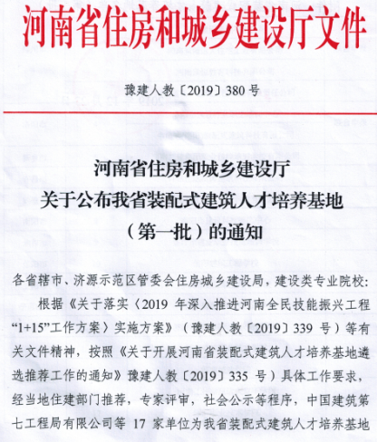 2019年12月,公司经省住建厅组织的专家评审、社会公示等程序,成功获批为河南省第一批装配式建筑人才培养基地(豫建人教[2019]380号)。