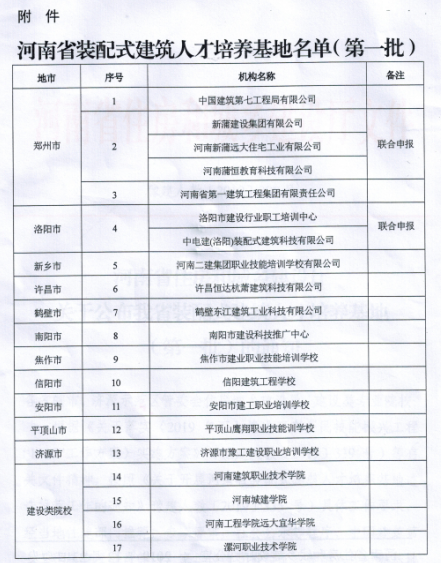 2017年以来,河南省政府办公厅颁发了《河南省建筑业转型发展行动计划(2017-2020年)》(豫政办[2017]152号)、《关于大力发展装配式建筑的实施意见》(豫政办〔2017〕153号),河南省住房和城乡建设厅也发布了《关于落实〈2019年深入推进河南全民技能振兴工程“1+15”工作方案〉实施方案》的通知(豫建人教[2019]339号)等文件推进装配式建筑。