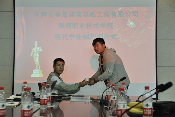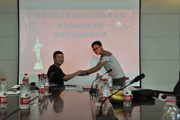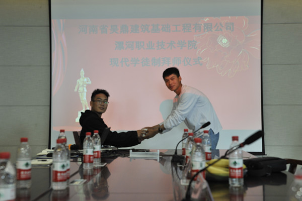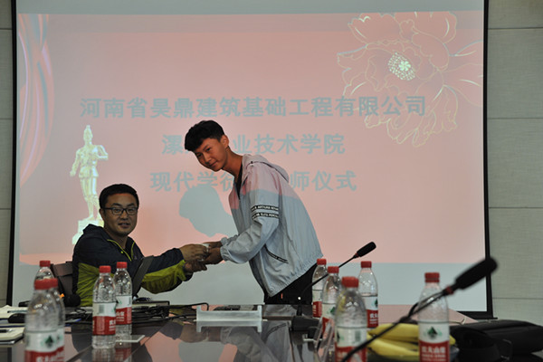 2019年5月24日下午,在河南省建设教育协会的指导下,yl6809永利2018级建筑工程技术现代学徒制班拜师仪式在河南省昊鼎建筑基础工程有限公司隆重举行。