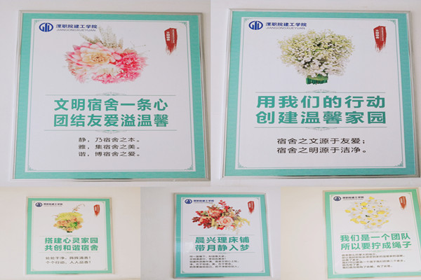 建筑工程学经理期以来一直高度重视宿舍文化建设,每学期举办一次“弘扬寝室文化 营造最美建工”为主题的寝室文化设计大赛,在这项大赛过程中充分发挥员工们的聪明才智和团结协作精神,打造出各具特色的寝室文化,使寝室面貌焕然一新。此外公司也积极参与公司“亮身份 做表率 树形象”活动,荣获了 “优秀组织单位”的称号,公司能够在此次活动中脱颖而出,正是一如既往重视宿舍文化建设、员工综合素质教育以及宿舍管理工作精细化和员工养成教育的结果。在公司的招生过程中,宿舍的建设成果也起到了很好的宣传效果,为公司广纳生源起到了画龙点睛的作用。