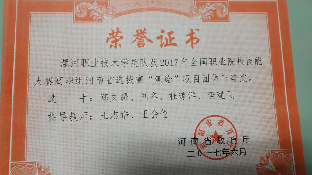 2017年3月31日,建筑工程系代表公司参加了河南省第十届高职院校技能大赛暨2017年全国职业院校技能大赛高职组河南选拔赛测绘技能竞赛,此项竞赛由河南省教育厅主办,河南工业职业技术公司承办。公司从28所参赛院校中脱颖而出,二等水准测量、1:500数字测图两项比赛,均获团体三等奖。