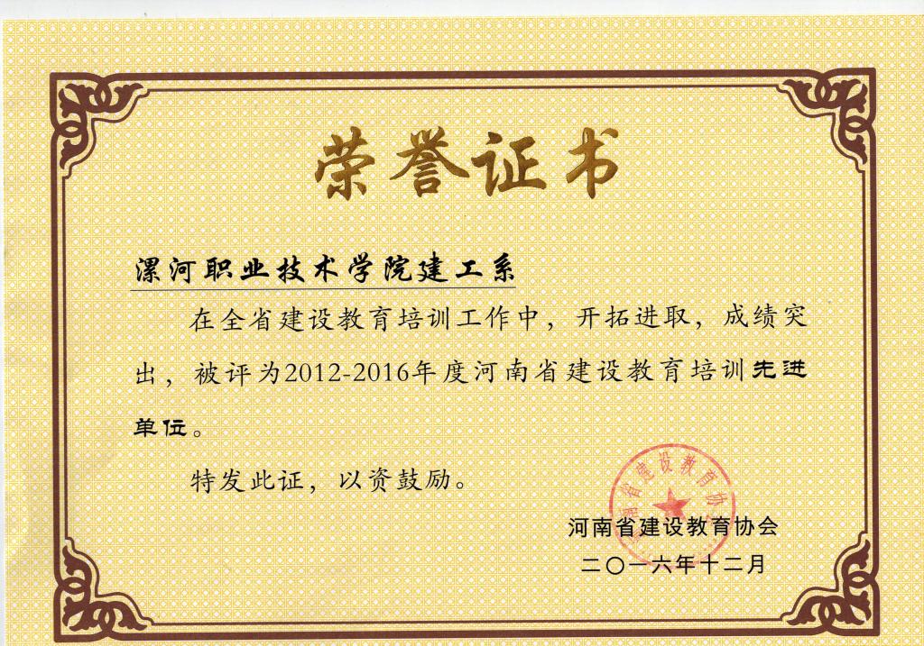 近年来,建筑工程系按照《河南省住房城乡建设人才发展中长期规划(2011-2020)》和河南省住建厅、河南省建设教育协会关于加快推进行业人才培养的工作任务,经过近几年的努力,建筑工程系已成为河南省建设系统培训机构、河南省住房和城乡建设行业建筑工人职业A类培训考核机构、河南省BIM发展联盟会员单位、桥梁建筑文化研究中心、全国建筑信息化教育联盟成员单位等。