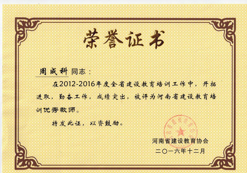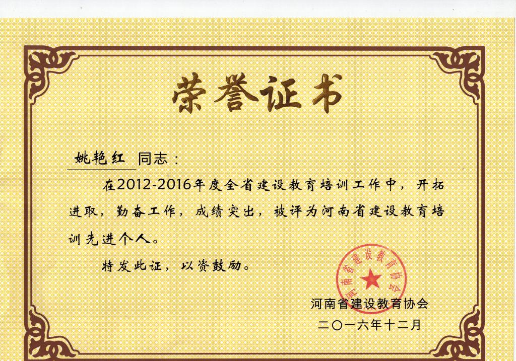 12月22日,河南省建设教育协会表彰会在郑州举行,建筑工程系作为会员单位被评为2012-2016年度河南省建设教育培训先进单位,姚艳红老师被评为先进个人,周成科老师被评为优秀教师!系主任赵冬梅当选为河南省建设教育协会第四届理事会理事会。
