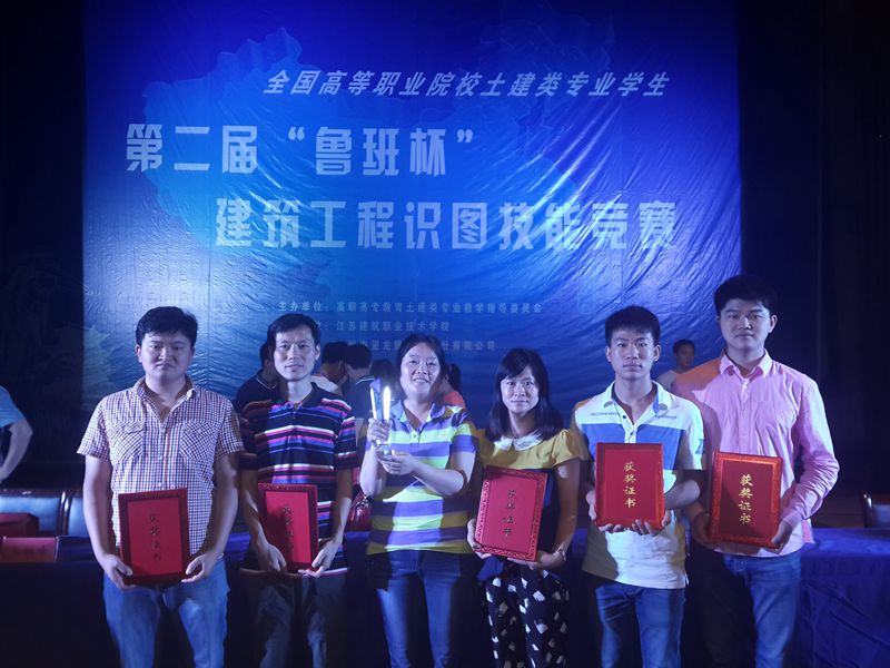 2014年5月16日--18日,在徐州举行的全国高职院校第二届“鲁班杯”建筑工程识图技能竞赛中,yl6809永利建筑工程系代表队在全国168支参赛队伍中脱颖而出,取得优异成绩,喜获团体一等奖,个人特等奖1项(任奕同学)、一等奖1项(桑占旗同学),姚艳红、何晓航、王志皓老师获得优秀指导教师奖。