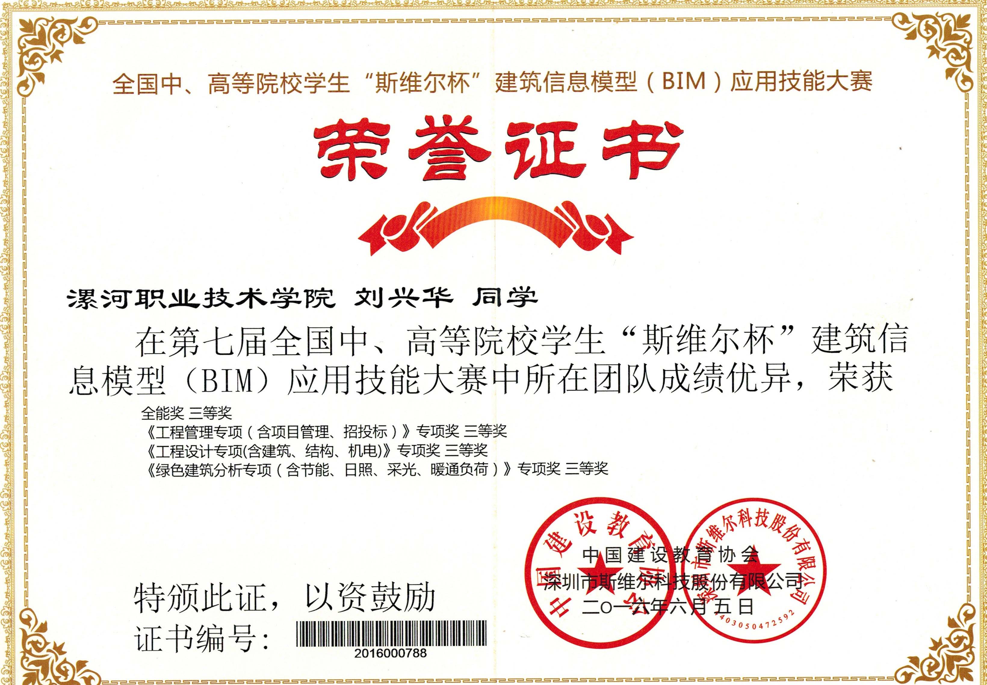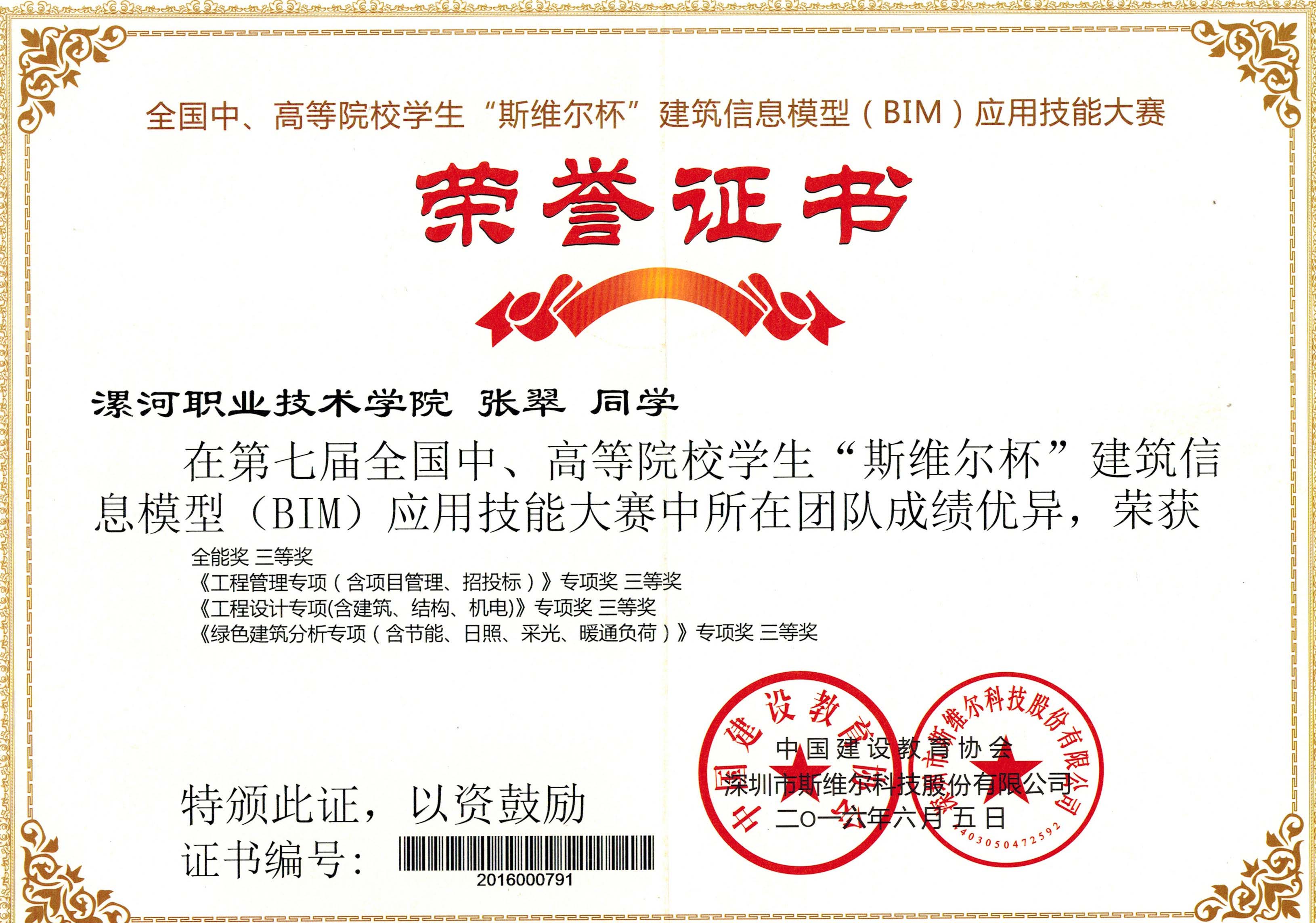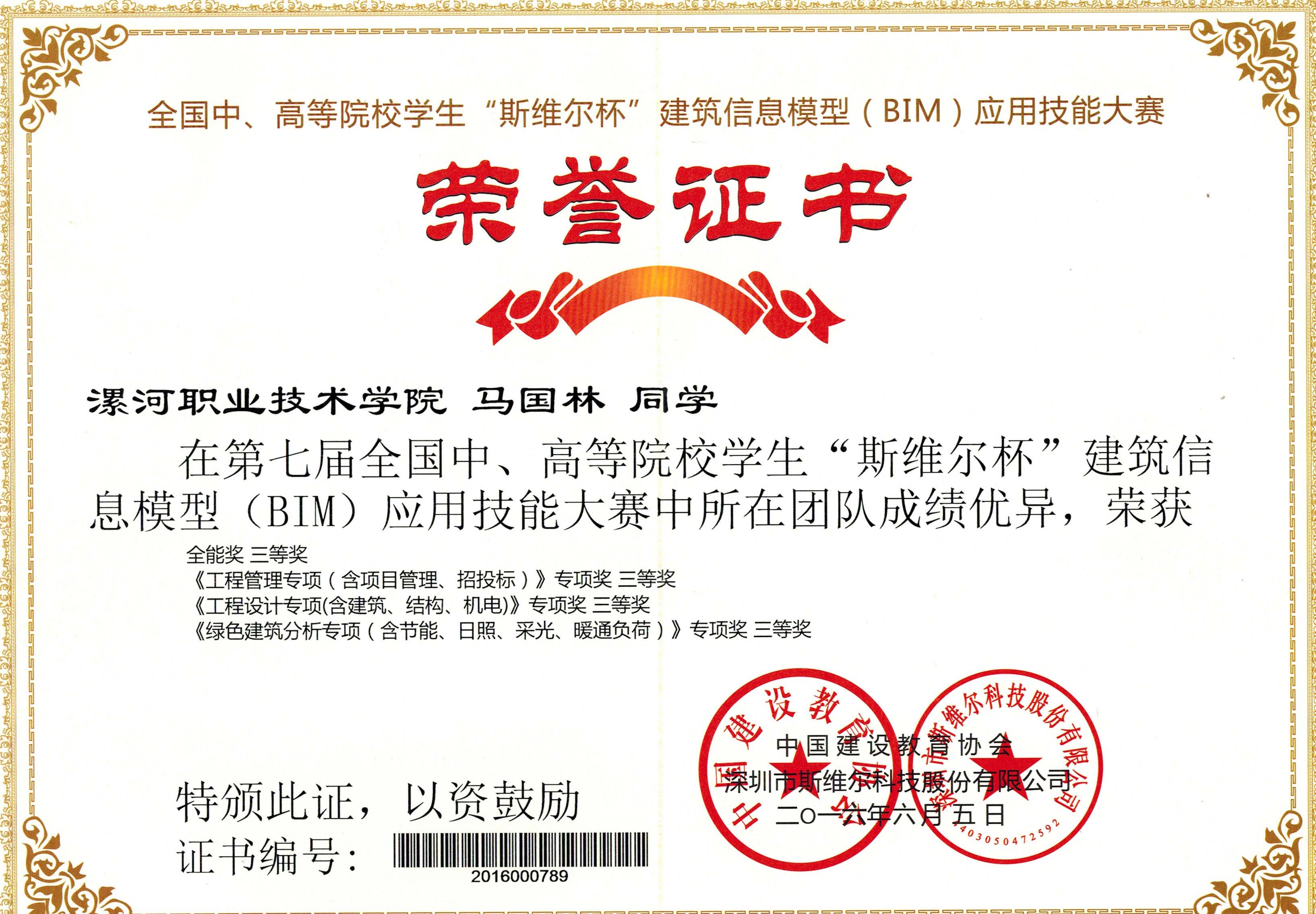 2016年6月4日,第七届全国中、高等院校“斯维尔杯”建筑信息模型(BIM)应用技能大赛总决赛在山东建筑大学和四川大学两个赛区联网同步举办。经过艰难角逐,建筑工程系代表公司荣获《工程管理专项(含项目管理、招投标)》、《工程设计专项(含建筑、结构、机电)》、《绿色建筑分析专项(含节能、日照、采光、暖通负荷)》三项单项奖三等奖,并获全能奖三等奖,属河南省专科院校参赛队最好成绩。