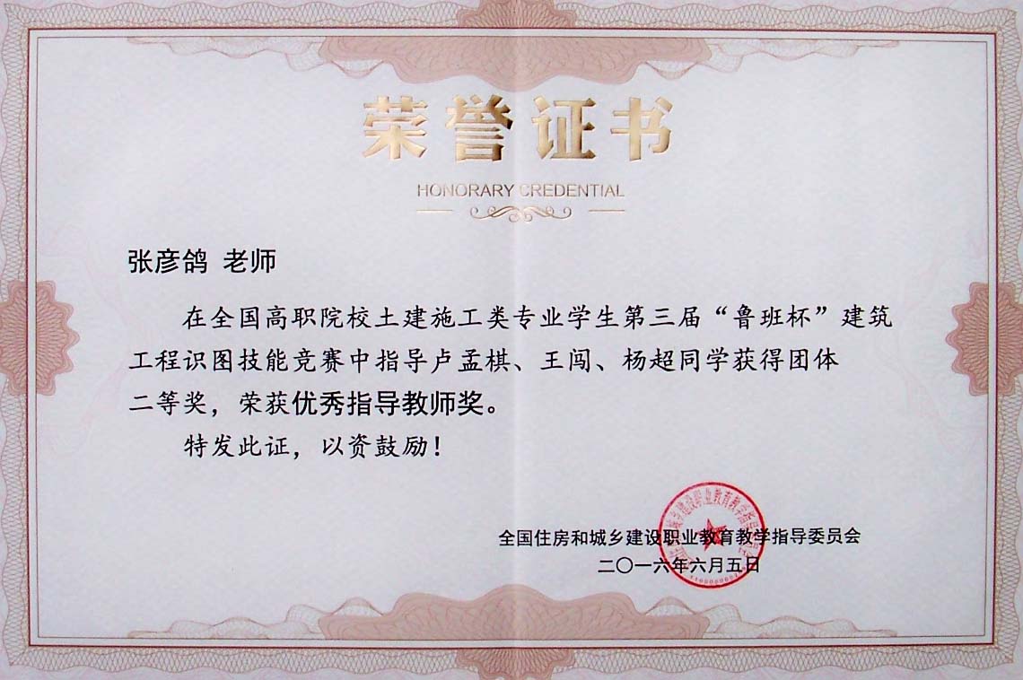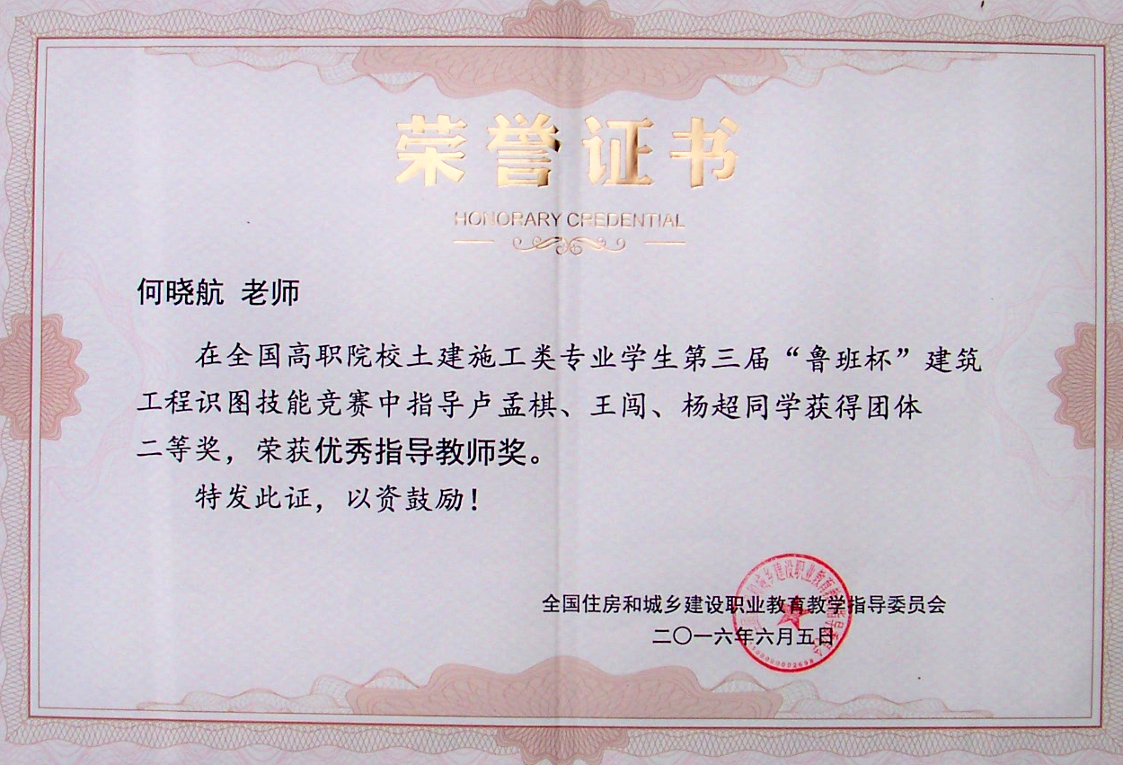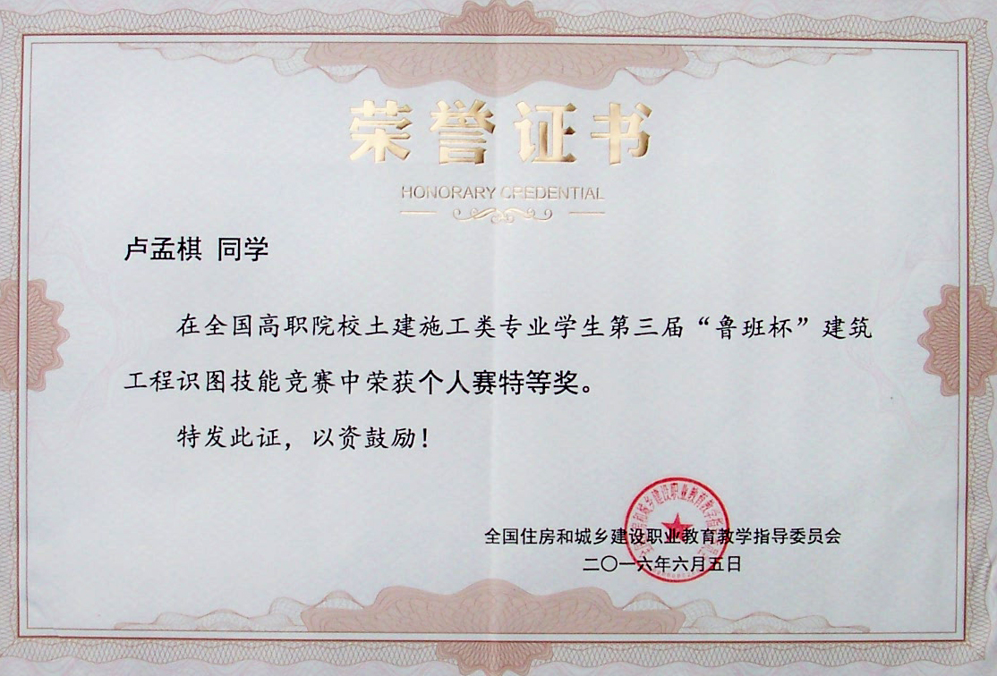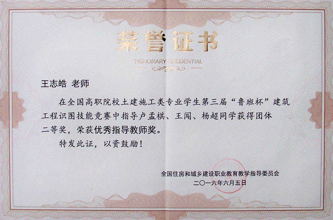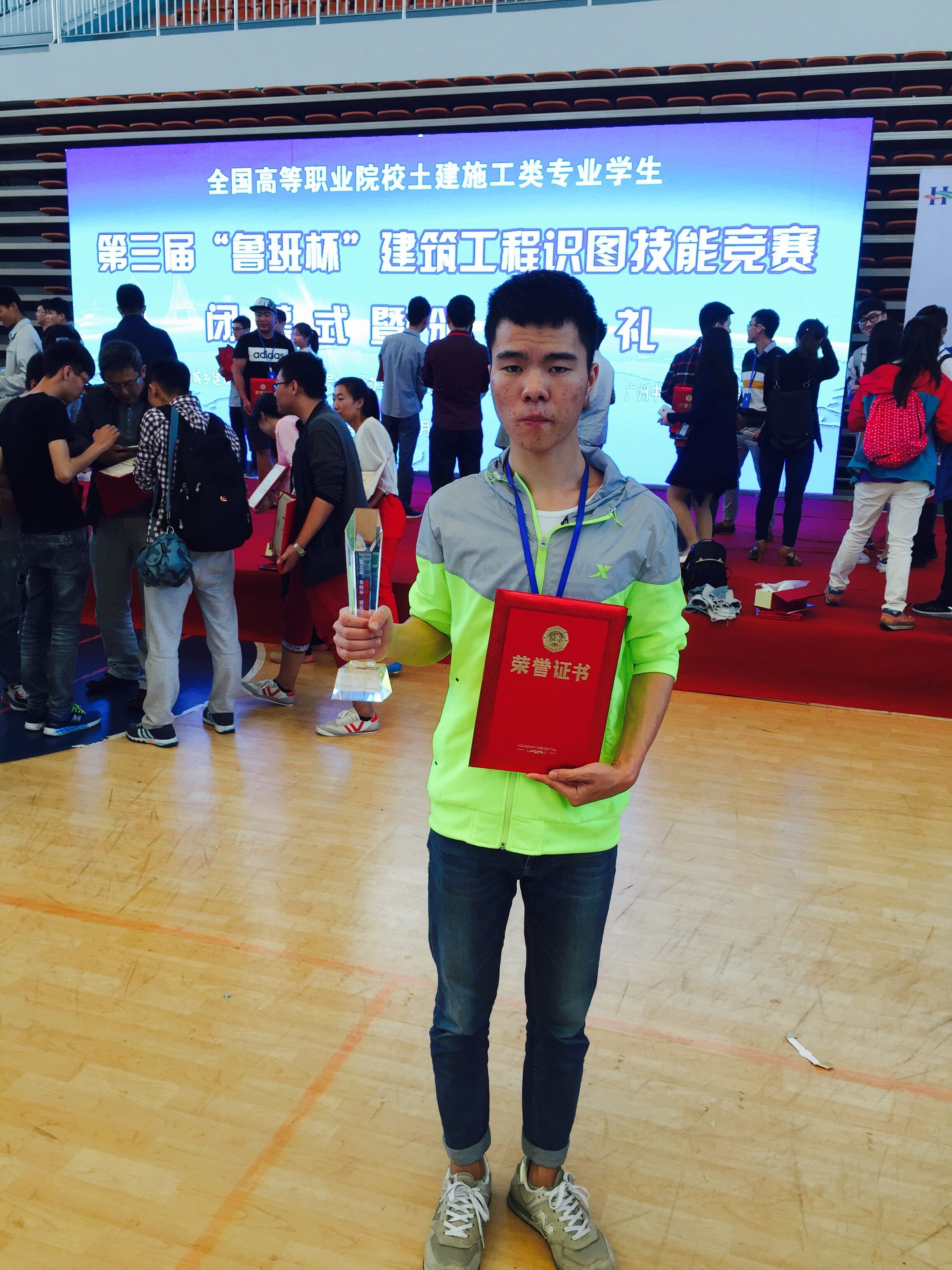 6月4日,在青岛举行的第三届全国高职院校土建施工类专业员工“鲁班杯”建筑工程识图技能竞赛,公司派出2014级建筑工程技术专业卢孟棋、王闯、杨超3位同学参赛,在比赛中他们发挥稳定、表现出色,喜获个人特等奖(卢孟棋)、团体二等奖,张彦鸽、何晓航、王志皓老师荣获优秀指导教师奖。