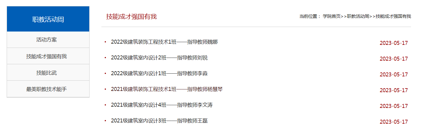 线上展示分三个板块:技能比武、技能成才强国有我、最美职教技术能手。在工程测量技术、建筑室内设计、建筑装饰工程技术专业开展技能大比武,并通过视频《装饰工程技术师生的十八般武艺》、《工程测量师生的一天》、《建筑室内设计师生的一天》进行展示;在师带徒实训过程中展示最美职教技术能手李文涛老师开展《建筑装饰工程施工》课程木工实训和瓷砖贴面实训场景;在建筑室内设计、建筑装饰工程技术专业开展“技能成才强国有我”写生作品展示。