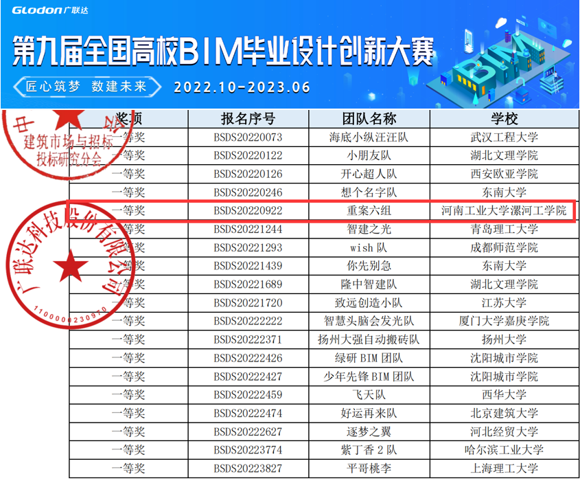 2023年5月19日下午,第九届全国高校BIM毕业设计创新大赛结果公布,漯河工公司建筑工程系19级工程管理专业“重案六组” 队(指导老师:刘惠林、陈燕霞;参赛员工:李泽昕、郭怡航、韩建坤、扶超、申佳美)在毕业设计大赛中获得一等奖。