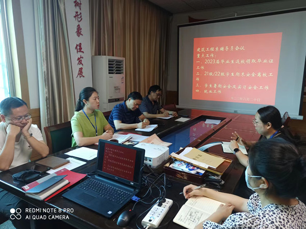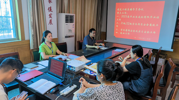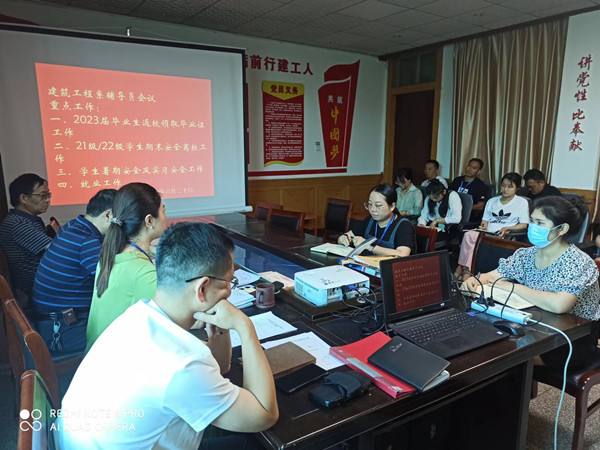 6月20日,建筑工程系在会议室举行毕业手续办理暨员工离校和暑期安全工作会议,参加会议有建筑工程系主任赵建功,党总支书记王皓,团总支书记王志皓,全体辅导员,会议由党总支副书记李文静主持。