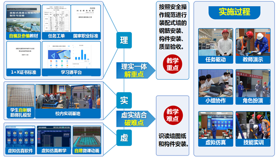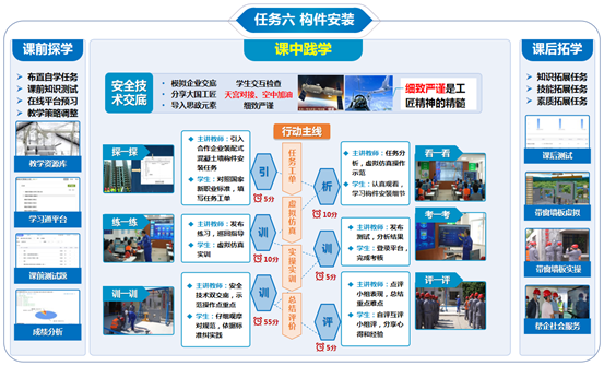 具体到一节课的教学环节,首先是课前探学,通过教学平台布置探学任务,根据探学结果,分析学情,调整教学策略;课中践学,通过对课前任务完成情况的分析点评,引出本节课的三维教学目标。对标国家职业标准、1+X职业技能等级证书要求以及职业技能大赛考核要点,布置贴合的实际工程任务工单,使用信息化手段(如虚拟仿真系统)分析任务工单。员工明确任务后,先观摩教师的虚拟平台示范,再分小组协作完成虚拟平台的实训和考核;考核合格后进入实操实训,仍然要教师先示范,员工再分小组协作完成实训和考核。总之,全过程贯彻理实一体、虚实结合、理虚实一体化。