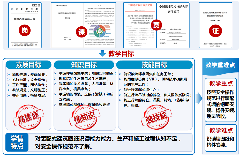 培训过程中李冠磊老师主要以今年参加教师教学能力大赛《装配式混凝土施工技术》课程教案为例进行讲解。他提出:好的教案离不开好的课程设计,因此首先要做好专业人才培养方案的分析。根据专业才培养方案,结合专业相关国家职业标准、1+X职业技能等级证书要求以及职业技能大赛考核要点,编写课程标准,确定教学目标、教学内容。根据学情分析、员工特点,确定教学重点、难点。充分利用软硬件教学资源、信息化教学手段,革新教学策略,突出重点,突破难点。
