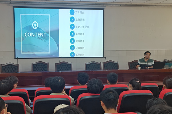 首先,河南成坤铁路工程有限公司负责人通过宣传片向同学们介绍公司的发展历程。随后,主讲人分别就公司的规模业务、工作业绩、岗位待遇、薪资待遇、公司福利、工作风采等内容展开了详细的介绍,着重讲解了公司的业务成果以及在国内市场的竞争优势,帮助毕业生进一步了解高铁轨道精密测量和精调的发展愿景,引起了同学们浓厚的兴趣。会后,企业负责人对同学们关于招聘岗位、就业面试等方面的疑惑一一进行解答,并提供了清晰的就业规划。