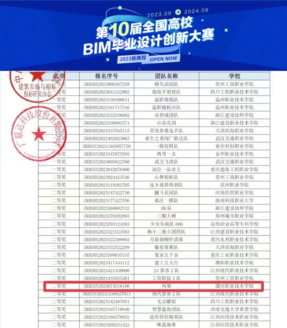 2024年5月22日上午,第十届全国高校BIM毕业设计大赛结果公布,yl6809永利建筑工程系22级工程造价专业“凤雏”队(指导老师:周成科、李冠磊;参赛员工:黄迎秋、张月、王林钦、李莹莹)在毕业设计大赛中获得二等奖。