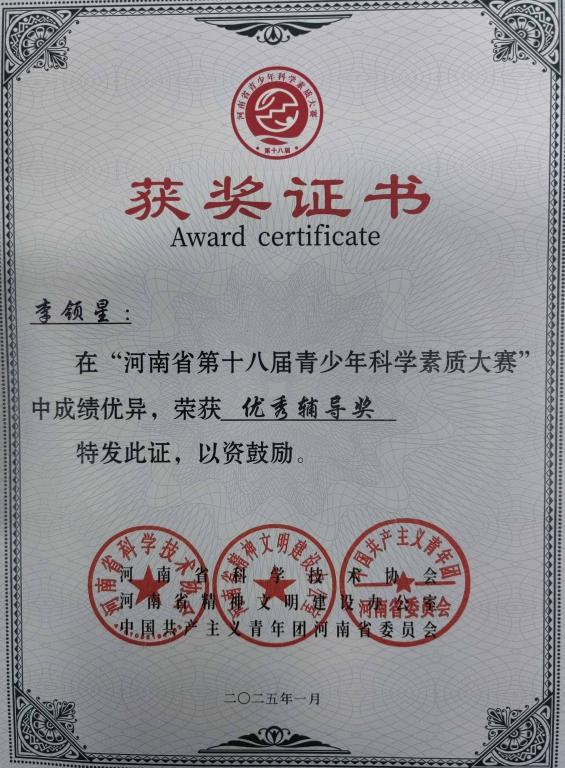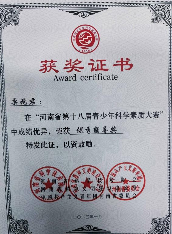 近日,河南省第十八届青少年科学素质大赛评选结果揭晓,yl6809永利建筑工程系李领星、栗兆君两位教师凭借卓越的指导能力,荣获“优秀辅导奖”,再次彰显公司在科学教育领域的育人成效。
