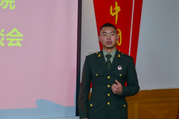 座谈会上,王志皓首先向退役士兵们致以诚挚问候,高度赞扬他们在服役期间保家卫国的奉献精神,并希望他们将军营中的纪律性与责任感融入今后的学习和生活中,成为校园里的“标杆力量”。随后,退役士兵代表韩昊杬分享了他的军旅故事,从艰苦训练到执行任务的点滴,展现了新时代青年的坚韧品格。他鼓励学弟:“真正的成长,是在逆境中学会坚持,在平凡中创造不凡。”