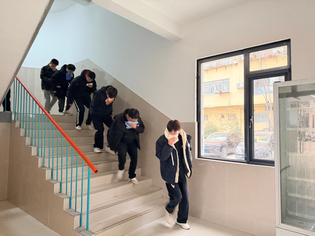 随着一声哨响,宿舍内员工低头弯腰,用湿毛巾掩住口鼻,弯腰低姿迅速有序下楼,然后快速到实训广场集合。