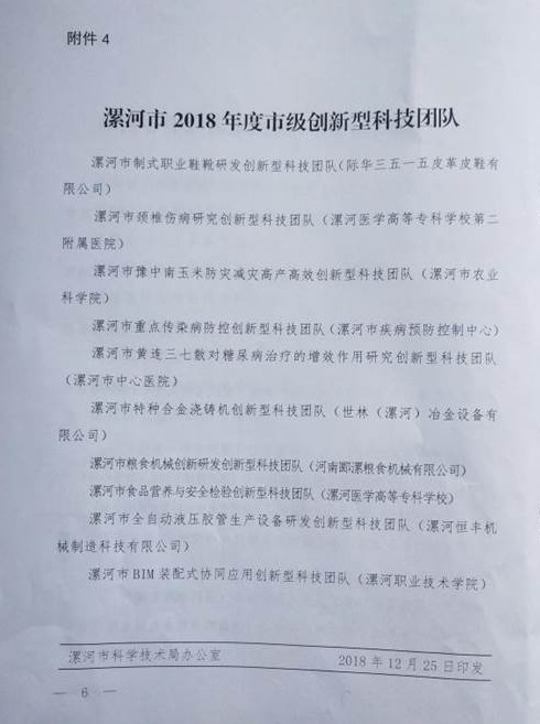 市级创新型科技团队的评选是漯河市科技局依照《漯河市创新型科技团队认定办法及管理办法(试行)》,经单位推荐、专家评审、现场考察、局党组织研究等多个严谨的环节逐步评选出来的,在全市数十个申报团队中最终择优认定了十个市级创新型科技团队。“BIM装配式协同应用创新型科技团队”在2018年初被评为校级科研创新团队重点扶持团队,拥有双师型高端人才,与河南省致诚工程技术有限公司、远大住宅工业集团股份有限公司、河南远大天成住宅工业股份有限公司进行校企合作,通过深度的产教融合拥有了一定的技术积累,明确了研发目标、增强了团队协作,当年获得了漯河市教育局、财政局、人社局下达的180万职业教育发展专项资金和公司配置的80.58万专项基金,用于建设BIM装配式协同应用创新中心及河南省装配式建筑示范性人才培养基地,为申报市级创新型科技团队打下了坚实的基础。