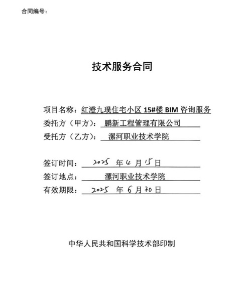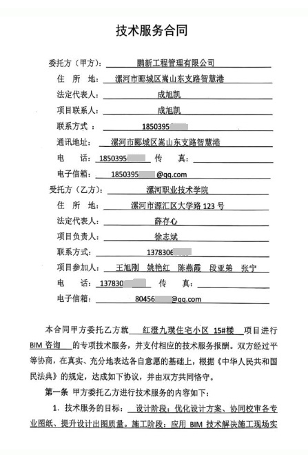 新型建筑工业化科技创新平台团队成员徐志斌、姚艳红等校企合作项目红澄九璞住宅小区15#楼BIM咨询技术服务合同。